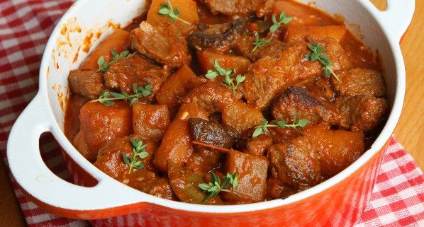 Priprava: Suho meso operemo, pustimo nekaj časa v hladni vodi (da se malo razsoli), še enkrat operemo v mlačni vodi, zrežemo na kose in damo v lonec, nalijemo hladno vodo in pristavimo, da zavre. Na olju popražimo drobno sesekljano čebulo, da zarumeni, dodamo na koščke narezan olupljen paradižnik, in spet dušimo, dokler ni mehak še paradižnik. Še ne kuhano meso poberemo iz lonca, ga dodamo k čebuli in paradižniku in prilijemo 2-3 dl suhe juhe. Vse skupaj kuhamo, pred koncem, ko je meso že skoraj mehko, dodamo na rezine narezan olupljen krompir, popopramo, potresemo z mleto papriko in po potrebi dodamo še malo soli in vode. Janijo kuhamo pri zmerni temperaturi do mehkega in dokler se tekočina ne pokuha.