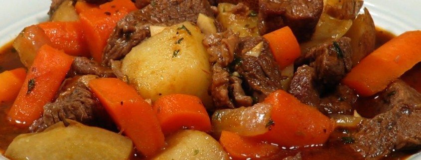 Priprava: Oprano meso razrežemo na večje kose, slanino na kocke, korenčka, peteršiljevo korenino, pastinakovo korenino in pol gomolja zelene pa ostrgamo in zrežemo na kolobarčke, pol šopka peteršilja in vejico zelene drobno sesekljamo, olupljen in opran krompir zrežemo na rezine, česen pa pustimo v glavici in stroke v lupinah (odstranimo samo zunanje suhe liste), olupljeno čebulo zrežemo na tanke kolobarje. V kozici raztopimo slanino, odstranimo ocvirke in na masti prepečemo meso, da lepo porumeni. V večjo posodo, najbolje v lonec ali v globoko ponev, stresemo tako meso z maščobo kot zelenjavo, premešamo, posolimo, dodamo poper v zrnju, prilijemo vino in toliko vode, da vse prekrije. Moko razmešamo z malo vode in vinskega kisa, dodamo zelenjavi in mesu in premešamo. Posodo pokrijemo z aluminijasto folijo, ki jo dobro pritisnemo ob rob posode. Jed pečemo pri zmerni temperaturi ali v pečici (175-200 °C), dokler se meso in zelenjava ne zmehčata, tekočina pa zgosti.