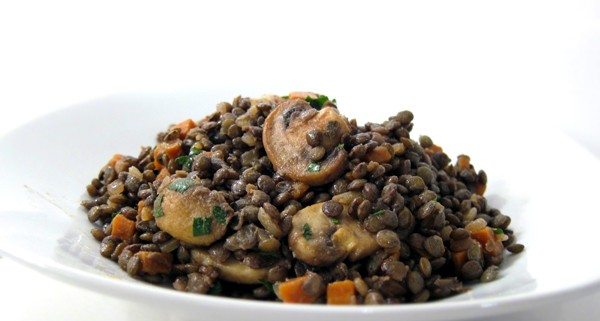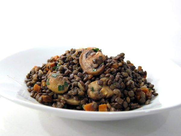V kozici segrejte 1 jušno žlico olivnega olja in 3 minute pražite čebulo, zeleno in korenje. Dodajte lečo, zelenjavno juho, vino, zelišča in ščepec popra ter malo soli. Zavrite, zmanjšajte temperaturo in kuhajte odkrito približno 20 minut, da se leča zmehča.
