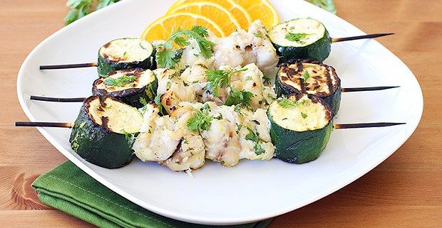 Rešetko za žar rahlo namažite z oljem – s tem preprečite, da bi se nabodala prijela. Na 4 palčke nataknite koščke ribe, gobe, bučke in čebule. Namažite z malo olja in pecite na poprej segretem žaru približno 10 minut. Med peko palčke večkrat obrnite.