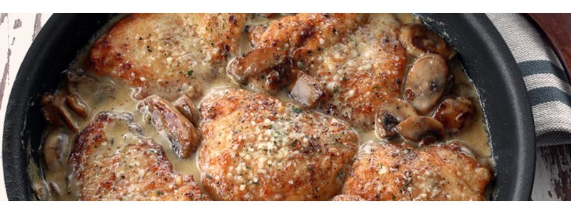 Pečico segrejte na srednjo temperaturo. V ponvi na hitro ocvrite kose kokoši. Denite jih v glinen pekač, prelijte s smetano, gobami in začinite. Pecite okoli 45 minut.